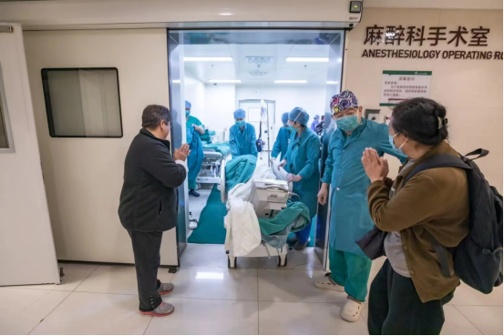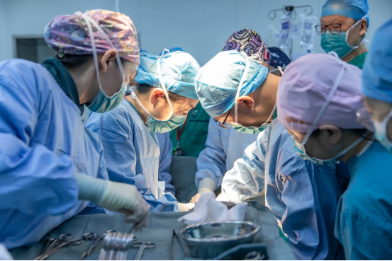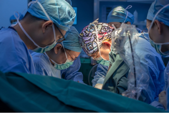 ▲樊慶泊(左三)團(tuán)隊(duì)與陳躍鑫(左二)團(tuán)隊(duì)在手術(shù)中