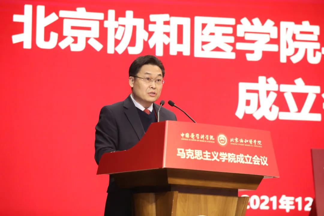 會上,國家衛生健康委直屬機關黨委常務副書記楊建立宣讀國家衛生健康委黨組書記、主任馬曉偉批示。馬曉偉指出,北京協和醫學院成立馬克思主義學院是在新時代新征程上全面貫徹習近平新時代中國特色社會主義思想,落實《關于加強新時代馬克思主義學院建設的意見》的重大舉措。要認真學習貫徹黨的十九屆六中全會精神,堅持正確辦學方向,堅持和加強黨的全面領導,聚焦馬克思主義中國化時代化最新成果的學習研究宣傳,切實發揮思想政治理論課立德樹人關鍵課程作用和馬克思主義理論學科引領作用,大力弘揚和傳承百年協和的優秀基因和精神內核。