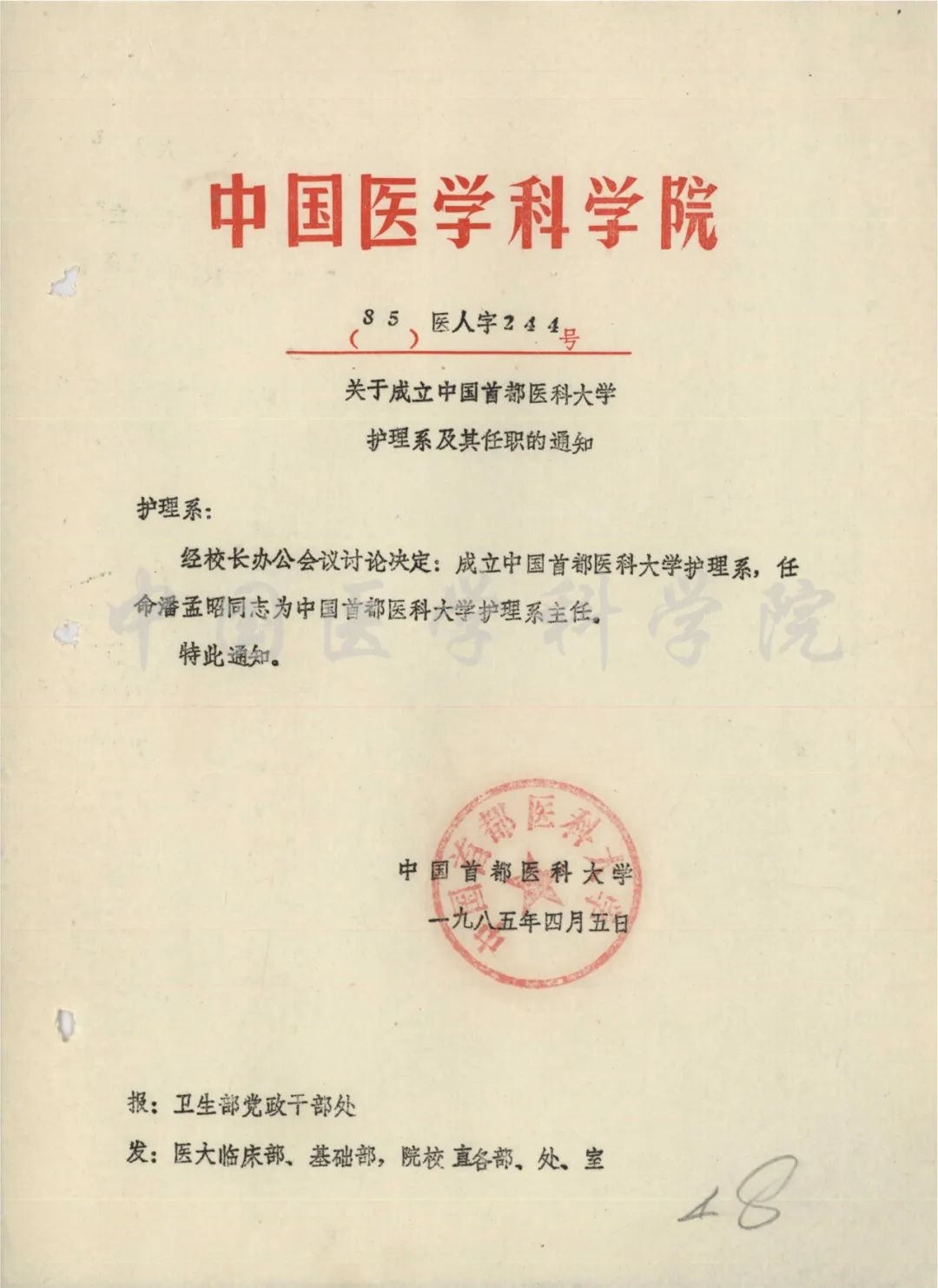 1985年4月5日關于成立中國首都醫科大學護理系及其任職的通知