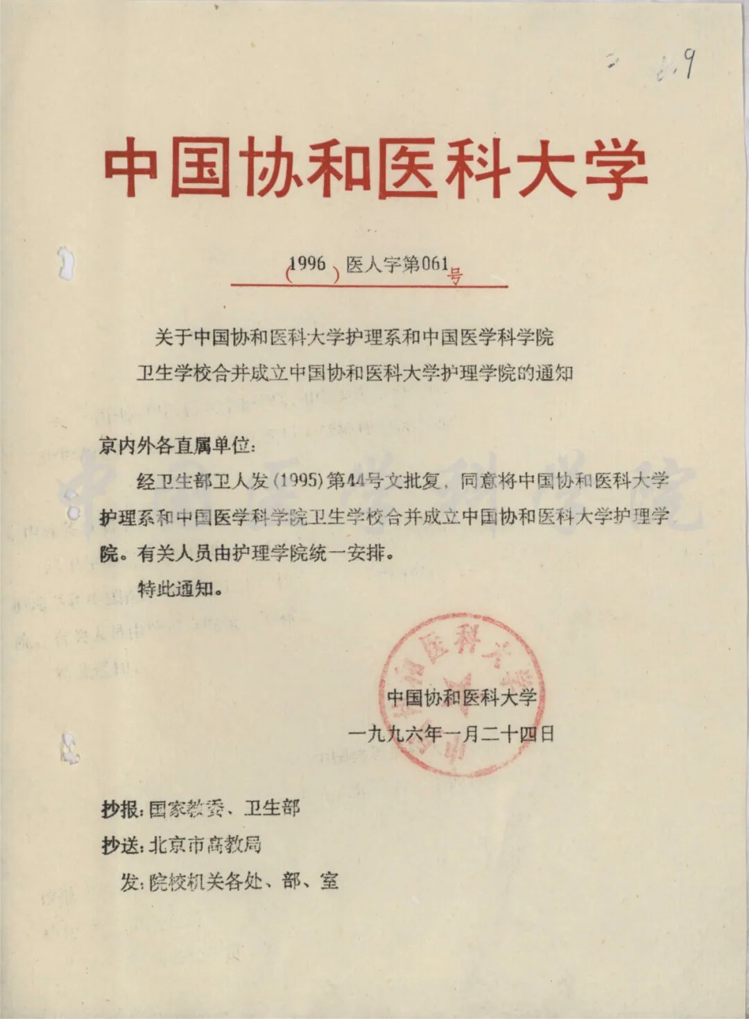 1996年1月24日關于中國協和醫科大學護理系和中國醫學科學院衛生學校合并成立中國醫學科學院護理學院的通知