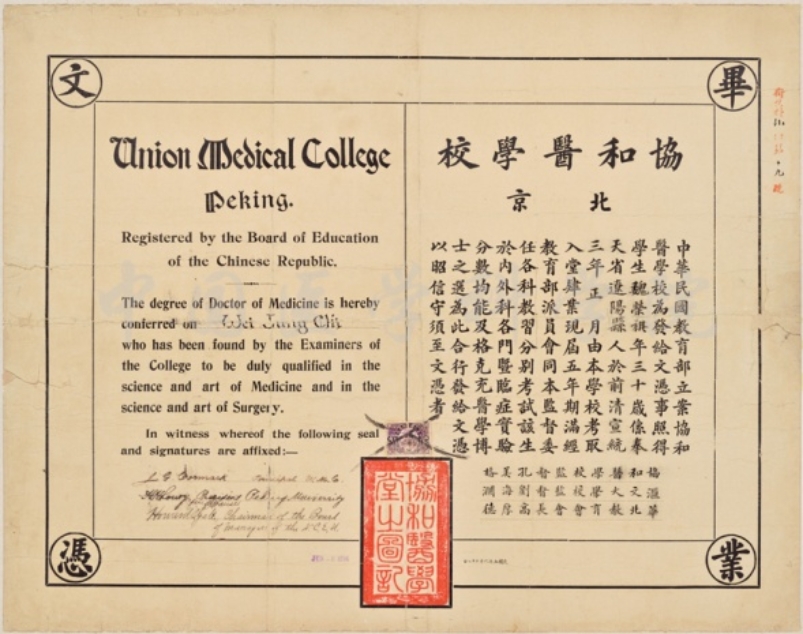 (我校前身協(xié)和醫(yī)學(xué)堂1916屆魏榮祺畢業(yè)證書。北京市退休教師魏德純于2020年6月2日主動捐贈,特別致謝!)