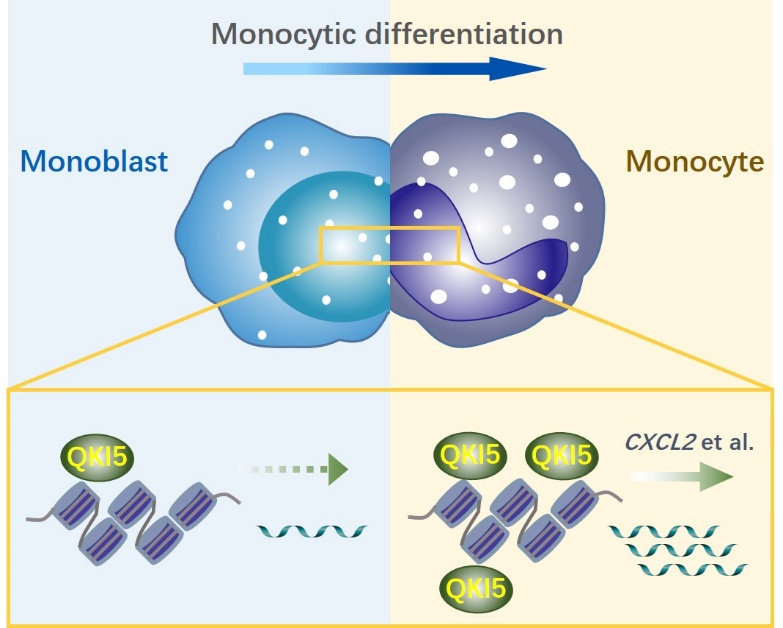 2021年10月14日,中國醫(yī)學(xué)科學(xué)院基礎(chǔ)醫(yī)學(xué)研究所余佳團(tuán)隊(duì)在Genome Biology期刊在線發(fā)表題為“A global screening identifies chromatin-enriched RNA-binding proteins and the transcriptional regulatory activity of QKI5 during monocytic differentiation” 的研究論文。該研究首次全局性描繪了造血細(xì)胞中染色質(zhì)富集型RBP的分布圖譜,并對其染色質(zhì)結(jié)合機(jī)制進(jìn)行探究,鑒定出RBP QKI5通過轉(zhuǎn)錄調(diào)控促進(jìn)單核細(xì)胞分化的新機(jī)制。