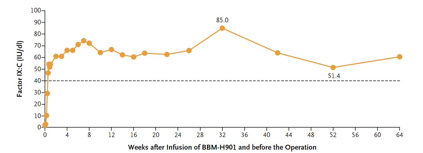 圖1:輸注攜帶FIX-Padua基因的載體BBM-H901后、術(shù)前的FIX活性水平。虛線顯示的活性水平為40 IU/dL