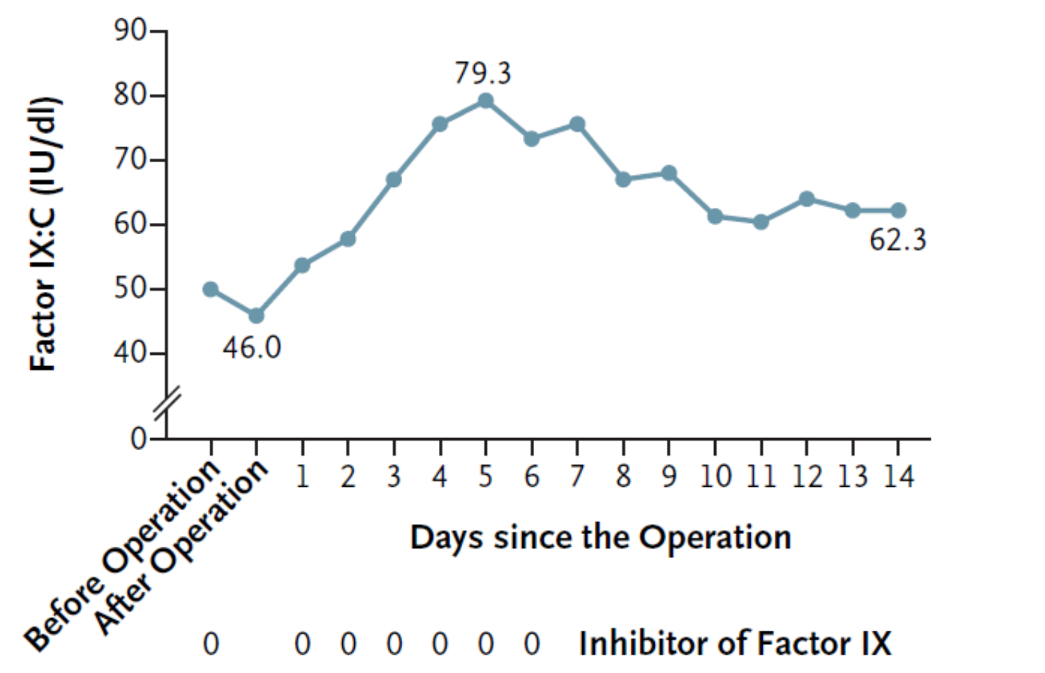 圖2:使用Dade Actin FSL活化部分凝血活酶時(shí)間(APTT)試劑,利用一期法測(cè)定的FIX活性水平,以及圍手術(shù)期FIX抑制物的檢測(cè)