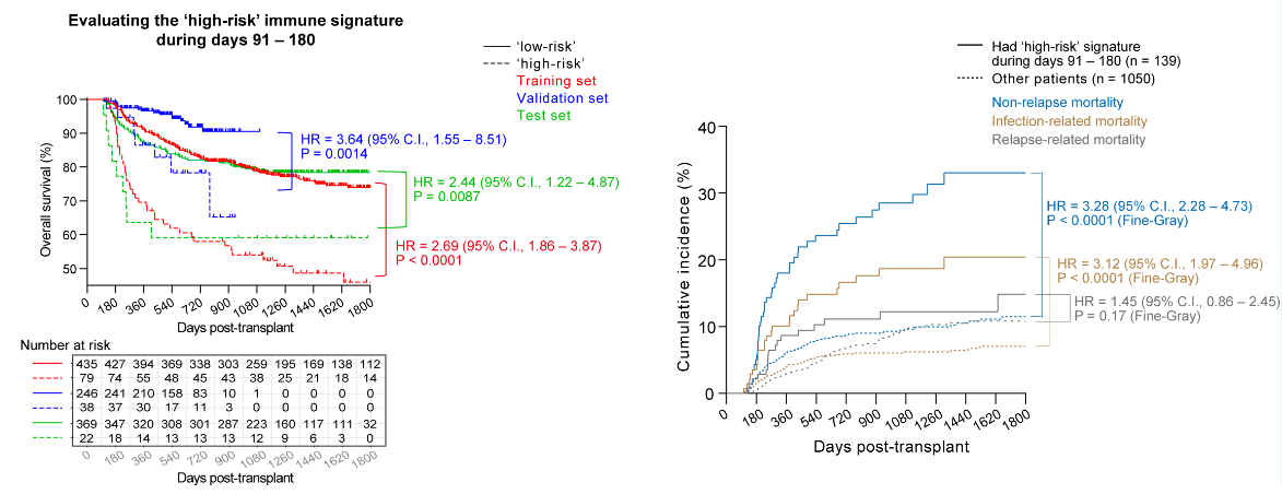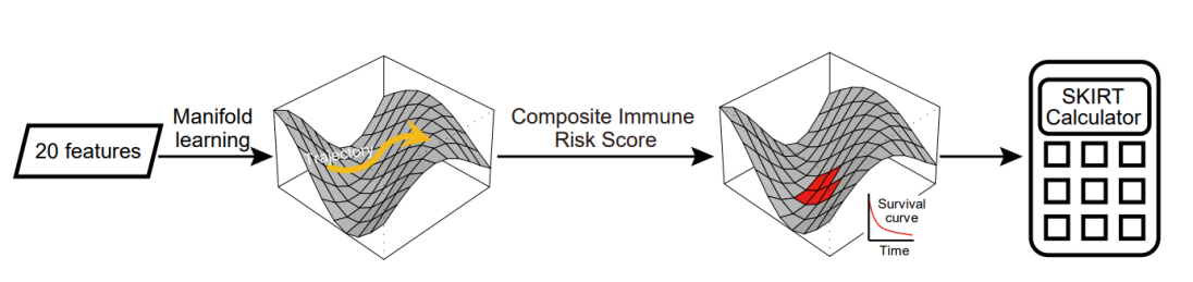 通過生存分析聯合Grid-Search優化策略,經交叉驗證發現移植后91–180天的免疫學特征可以預測異基因移植患者生存。為了尋找一個與“體質指數BMI”一樣簡單的計算方法,該研究通過整合八個關鍵免疫學指標,提出了易于臨床使用的綜合免疫風險評分(Composite Immune Risk Score, CIRS)來預測患者造血干細胞移植后的生存情況。CIRS在訓練集可以很好地預測全因死亡(HR = 2.69, P < 0.0001),并在獨立的驗證集(HR = 3.64, P = 0.0014)及外部測試集(HR = 2.44, P = 0.0087)得到證實。研究團隊還開發了可公開訪問的網絡工具— SKIRT計算器(https://skirt-calculator.shinyapps.io/skirt-calculator/),幫助臨床醫生評估患者移植后免疫重塑進展。