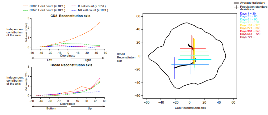 研究發現,移植后的前兩個月細胞數量恢復以CD8+ T細胞為主,隨后NK細胞、CD8+T細胞、CD4+T細胞和B細胞廣泛恢復,免疫重塑個體異質性在移植后約60天達到最大。