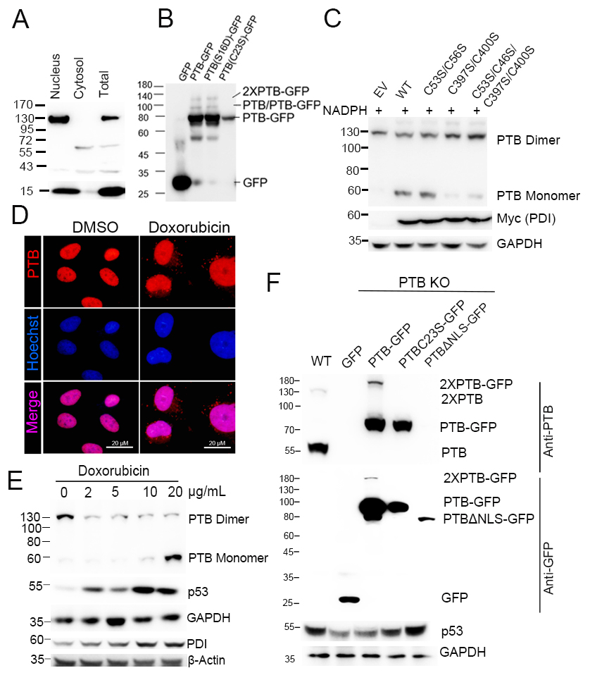 本研究團隊首次發現PTB在細胞核和細胞質中分別形成二聚體和單體,并將介導二聚體形成的氨基酸定位到第23位半胱氨酸;分子內或分子間半胱氨酸之間形成二硫鍵是最常見的蛋白質多聚體形成機制,這個過程主要是由硫氧還蛋白(thioredoxin,TRX)超家族催化。研究團隊對該家族的成員進行篩選后,發現蛋白質二硫鍵異構酶(protein disulfide isomerase,PDI)是調控PTB去二聚化的關鍵分子,并在DNA損傷模型中得到證實;進一步探討了DNA損傷應答中PTB去二聚化后的功能和機制,發現細胞質中的PTB單體能夠促進p53的翻譯,免疫沉淀和質譜鑒定結果提示這種作用可能是通過增加TP53 mRNA與翻譯機器的相互作用來實現的。本研究揭示了RNA結合蛋白多聚體和單體的相互轉換能夠影響其亞細胞定位,進而對下游基因的翻譯進行調控,擴展了對RNA結合蛋白作用機制的認識。