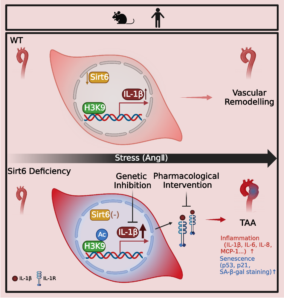 該研究發現SIRT6在臨床散發型TAA樣本中膜表達顯著降低。血管緊張素II(Angiotensin II, Ang II)刺激促進血管平滑肌SIRT6敲除小鼠TAA的形成及破裂,增加其死亡率以及血管炎癥和衰老。生物信息學及生化分析發現以IL-1β為核心的炎癥反應是SIRT6缺失導致TAA形成的關鍵早期因素。SIRT6通過去乙酰化IL-1β啟動子區域H3K9和H3K56的乙酰化水平轉錄調控IL-1β的表達,進而影響血管炎癥、衰老以及TAA的形成。該研究揭示了去乙酰化酶SIRT6抑制血管炎癥和衰老預防TAA,為散發型TAA的防治提供了表觀干預策略。