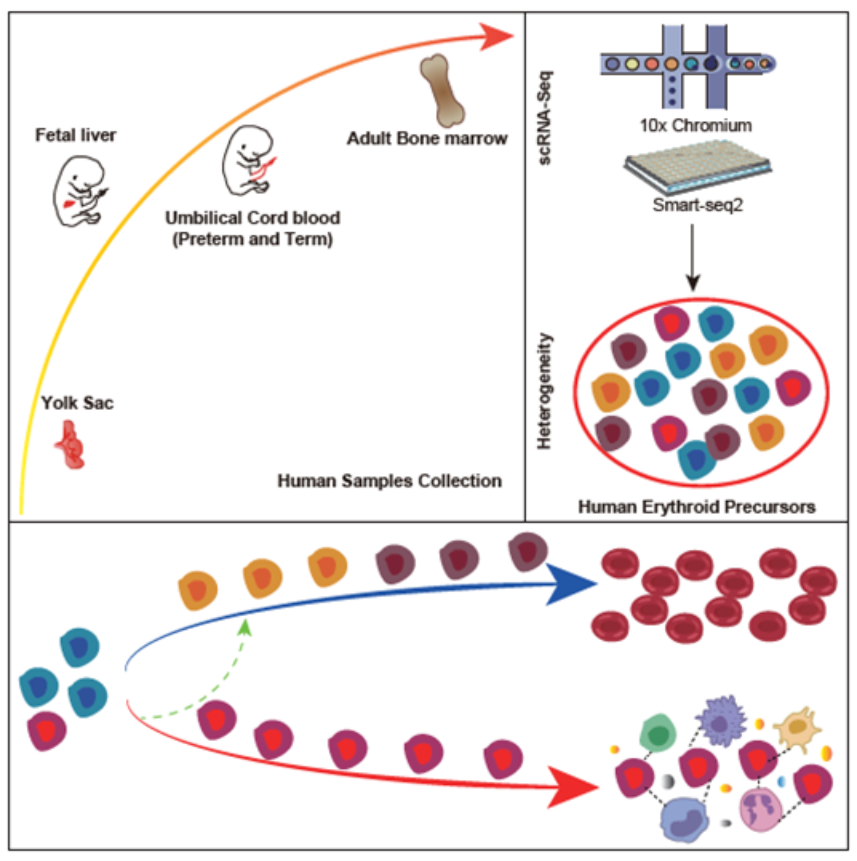 紅細胞作為機體數量最多的血細胞,也是最早出現的血細胞之一,其所承載的攜氧功能對人體健康和生命維持至關重要,并伴隨機體造血發育的全過程。盡管長久以來紅細胞一直被認為是均質的攜氧細胞,近年來的一些研究提示紅細胞具有一定的免疫調控特征,此外,還有研究表明病理狀態下的紅細胞同樣發揮免疫調控功能,在疾病的進展中發揮重要作用,但紅細胞免疫調控是所有紅細胞兼而有之還是部分紅細胞所特有,即紅細胞是否具有功能異質性,仍是領域的前沿科學問題。該科學問題的解析依賴于我們對單個紅細胞分子特征的全面認知。但由于技術的局限,人早期胚胎發育紅細胞的研究止步于形態學描述,其分子特征、群體組成及功能異質性等知之甚少,嚴重制約了對紅細胞新功能的探索。
