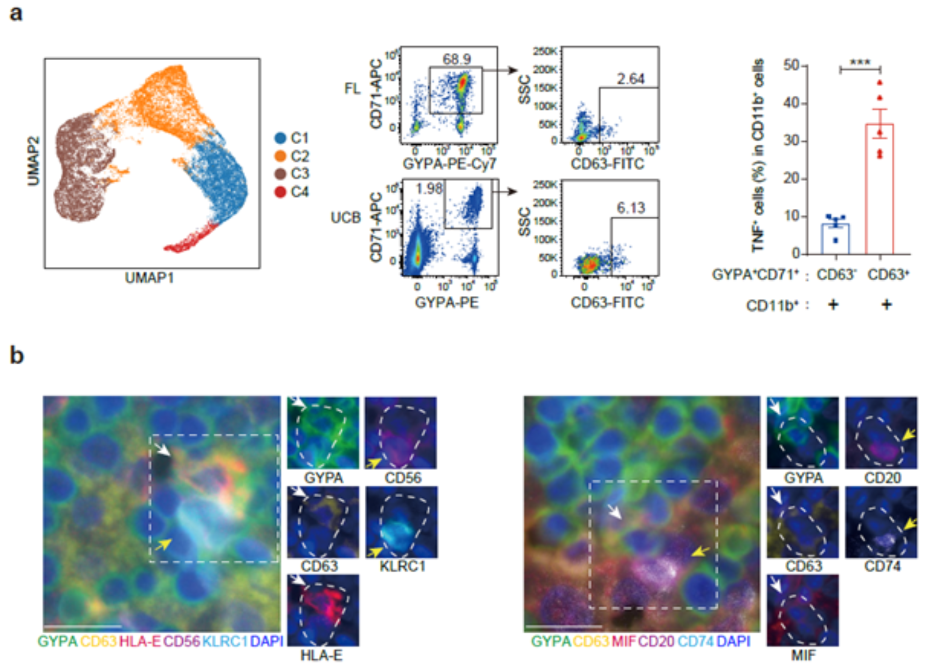 隨后,研究人員將重點聚焦在上述發現的免疫調控紅細胞亞群,時序分析發現該亞群具有與經典紅細胞不同的分化路徑。通過計算,研究人員篩選到免疫調控紅細胞亞群中特異性高表達的表面標志CD63,并在人胎肝組織原位檢測到CD63表達的有核紅細胞。為了進一步探究該細胞亞群的功能,研究人員從人胎肝、臍帶血及成年骨髓多個位點分選出表達CD63的有核紅細胞亞群,并將其與不同的免疫細胞群體共孵育,發現其顯著促進了免疫細胞中炎癥因子的分泌,證明了該亞群的具有免疫調控功能。細胞間互作(受配體對)分析還發現,與經典有核紅細胞相比,免疫調控紅細胞與各種免疫細胞之間存在更廣泛、更強的潛在相互作用。機制分析發現,免疫調控紅細胞還兼容了紅細胞與免疫細胞兩套轉錄調控。總之,這些結果證明了免疫調控紅細胞亞群的調控功能,并提供了免疫調控紅細胞調控免疫細胞的分子基礎。