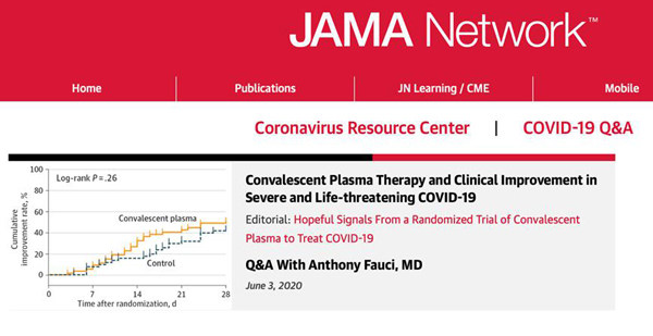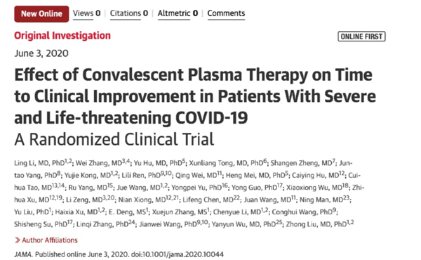 2020年6月3日,《美國(guó)醫(yī)學(xué)會(huì)雜志》(Journal of the American Medical Association,JAMA)在線發(fā)表中國(guó)醫(yī)學(xué)科學(xué)院輸血研究所劉忠團(tuán)隊(duì)完成的題為“Effect of Convalescent Plasma Therapy on Time to Clinical Improvement in Patients With Severe and Life-threatening COVID-19”的研究論文,報(bào)道恢復(fù)期血漿對(duì)重癥和危重癥新冠肺炎的治療效果。