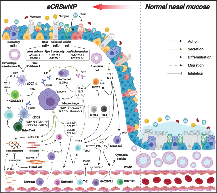 本研究通過單細胞轉錄組測序技術建立了正常人、慢性鼻竇炎不伴鼻息肉、嗜酸性慢性鼻竇炎伴鼻息肉以及非嗜酸性慢性鼻竇炎伴鼻息肉3種CRS亞型患者的鼻腔黏膜免疫和非免疫細胞的單細胞圖譜,并對影響慢性鼻竇炎病程發生發展和亞型分化的內在分子機制進行了研究,系統定義了在eCRSwNP中影響病程進展的局部組織微環境內的關鍵因素,一是基底細胞的過度增生異常分化及保護性細胞分子的缺失,導致屏障功能受損;二是胞外基質重塑和成纖維細胞、巨噬細胞、血管內皮細胞、平滑肌細胞等細胞亞群的功能紊亂;三是TH2細胞、ILC2細胞、IL5RA+漿細胞、細胞毒性CX3CR1+CD8+TEFF細胞和NK細胞增加并伴隨CD8+TRM細胞缺失;四是NK-cDC1 免疫監視軸功能喪失和ALOX15+ cDC2-TH2交互作用軸功能的過度激活;五是ALOX15+巨噬細胞的富集,并作為主要的趨化效應細胞,促進炎癥相關細胞的浸潤,從而驅動2型免疫反應發生(見圖1)。
