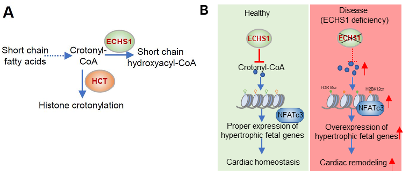 心臟是一個高耗能器官,其中70%-90%的能量來自于脂肪酸代謝,脂肪酸代謝不僅為心肌細(xì)胞提供能量,同時會產(chǎn)生許多代謝物(如巴豆酰輔酶A、酮戊二酸等)來修飾組蛋白,從而影響細(xì)胞的表觀遺傳和基因表達(dá)。組蛋白的表觀修飾在維持心臟穩(wěn)態(tài)過程中發(fā)揮重要作用,其中組蛋白巴豆酰化(Kcr)是近年來發(fā)現(xiàn)的一種新型組蛋白修飾。ECHS1作為能量代謝關(guān)鍵分子SIRT3的下游參與細(xì)胞脂肪酸的β-氧化過程,其能夠水解巴豆酰輔酶A,后者可通過組蛋白巴豆酰轉(zhuǎn)移酶(HCT)的作用,參與組蛋白修飾調(diào)節(jié)(Figure A)。超過60%的ECHS1突變攜帶者會發(fā)生肥厚型或擴(kuò)張型心肌病。