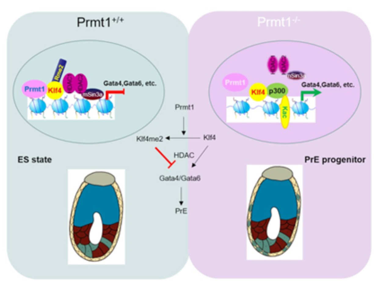 哺乳動物胚胎發育早期的第二次細胞命運決定至關重要。然而,其潛在的分子機制在很大程度上尚未探明。本研究發現蛋白質精氨酸甲基轉移酶家族成員Prmt1是PrE形成的重要調節因子。Prmt1基因缺失促進了小鼠胚胎干細胞(mESC)中PrE基因的表達。單細胞RNA測序和流式細胞術等分析表明,Prmt1的敲除導致mESC中形成一個新興的細胞集群,其中PrE特征基因顯著上調;Prmt1敲除顯著增加了胚外內胚層細胞(XEN)的誘導效率。分子機制研究發現,Klf4是Prmt1特異的底物分子,Prmt1特異性甲基化修飾Klf4分子396位精氨酸,這是募集抑制性mSin3a/HDAC復合物進而沉默PrE基因所必需的。小鼠胚胎嵌合試驗表明,Prmt1甲基化活性抑制或者Klf4的Arg396突變均可誘導mESC整合到PrE譜系中。