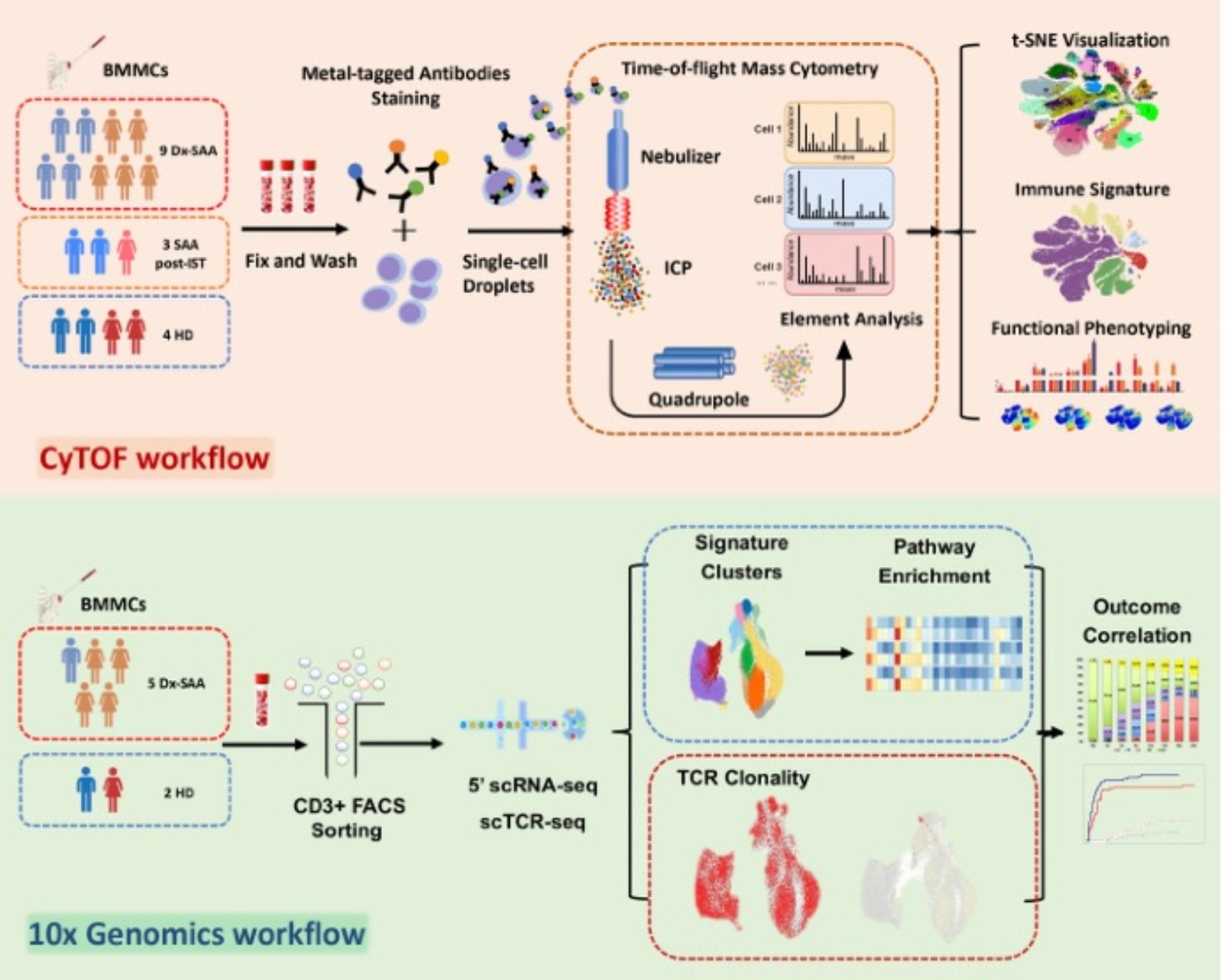 該研究在對9例初診SAA(Dx-SAA)、3例接受免疫抑制治療(IST)后SAA(postIST-SAA)及4例正常兒童供者(HD)來源的骨髓單個核細胞(BMMCs)利用質譜流式(CyTOF)分析后發現,與postIST-SAA及HD相比,兒童Dx-SAA呈現顯著的BMMCs比例失衡,造血干、祖細胞數目急劇下降,而免疫微環境中T細胞比例明顯上調。經蛋白表達特征分析發現,比例上調的CD4+ T細胞呈現CD45RA和CCR7表達水平增高,且NF-kB(pNFkBS529)及STAT3(pSTAT3Y705)磷酸化水平顯著激活,提示該細胞亞群極有可能為異常激活的CD4+ na?ve T細胞。