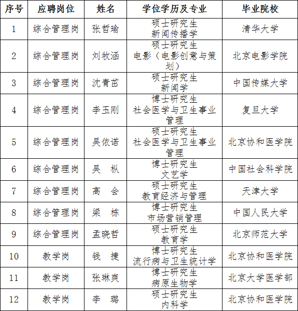 根據事業單位公開招聘工作有關規定,現將中國醫學科學院北京協和醫學院機關2020年度擬聘用事業單位工作人員予以公示。公示期間,如有問題,請向我單位反映。