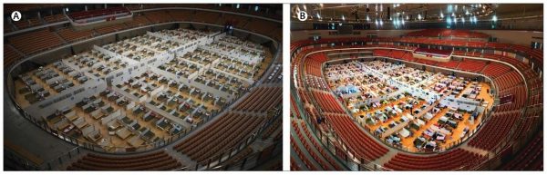 圖5:中國武漢市暴發(fā)新冠肺炎疫情期間,一家由體育館改造成的方艙庇護(hù)醫(yī)院 (左圖為收治患者前,右圖為收治患者后情況)