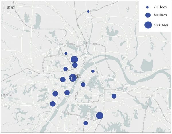 圖4: 中國武漢市暴發(fā)新冠肺炎疫情期間,方艙庇護(hù)醫(yī)院的位置和容量(圓的大小與相應(yīng)方艙庇護(hù)醫(yī)院的病床數(shù)量成正比)