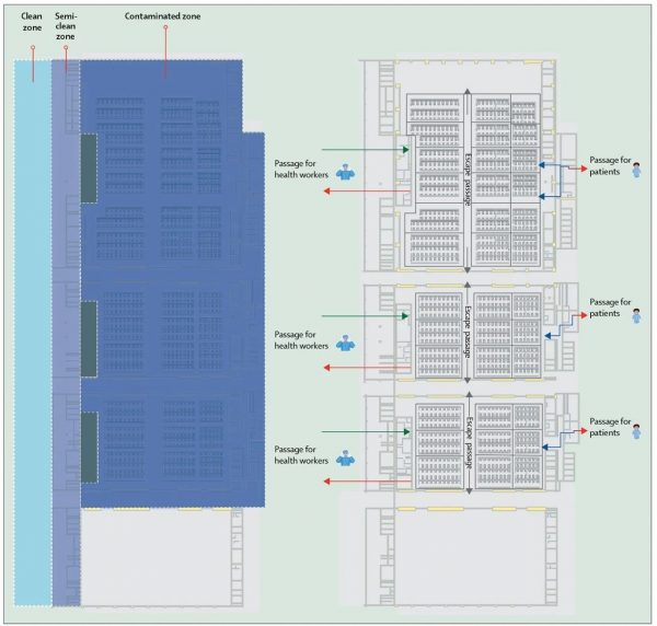 圖2:中國武漢一家由會(huì)展中心改建的方艙庇護(hù)醫(yī)院的區(qū)域和通道設(shè)置