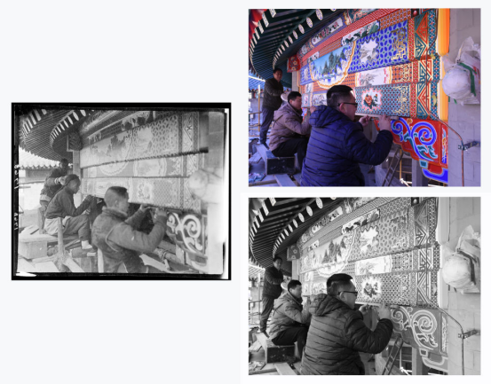 用一周時間徹底剝離一根存在安全隱患的電線;將修復(fù)后的彩畫照片調(diào)成黑白,和百年前圖片反復(fù)比對調(diào)整;歷時一年半研究恢復(fù)院門口石獅子的歷史位置……