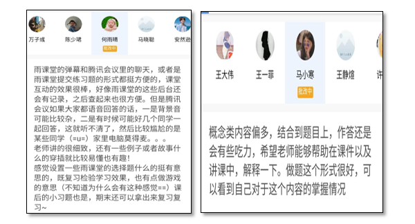 作為伴隨“互聯網”成長起來的一代,同學們習慣并喜歡隔著屏幕表達自己的觀點。在傳統面授課堂中,礙于面子,很多同學不擅于表達自己的看法。社區護理學系教師們尊重同學們的交流習慣和喜好,選擇“雨課堂”的彈幕功能作為師生課堂溝通的主要方式,打破了傳統課堂中的“一片寂靜”?!鞍l表彈幕不會透露姓名”,一旦遇到不懂的地方就可以直接提出,無需顧忌面子問題,并可得到老師的及時反饋,少了“害羞”,師生交流更加自由、自然,“也避免了老師課上提問無人回答的尷尬場面”,活躍了上課氛圍,“互動增多后走神的情況也有所好轉,整堂課下來,效果不輸傳統課堂”。