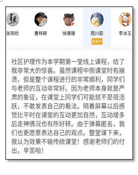 從三周的線上授課反饋情況看,同學們對《社區護理學》線上課堂氛圍、互動形式、教學內容設置給予了正向評價和中肯建議。