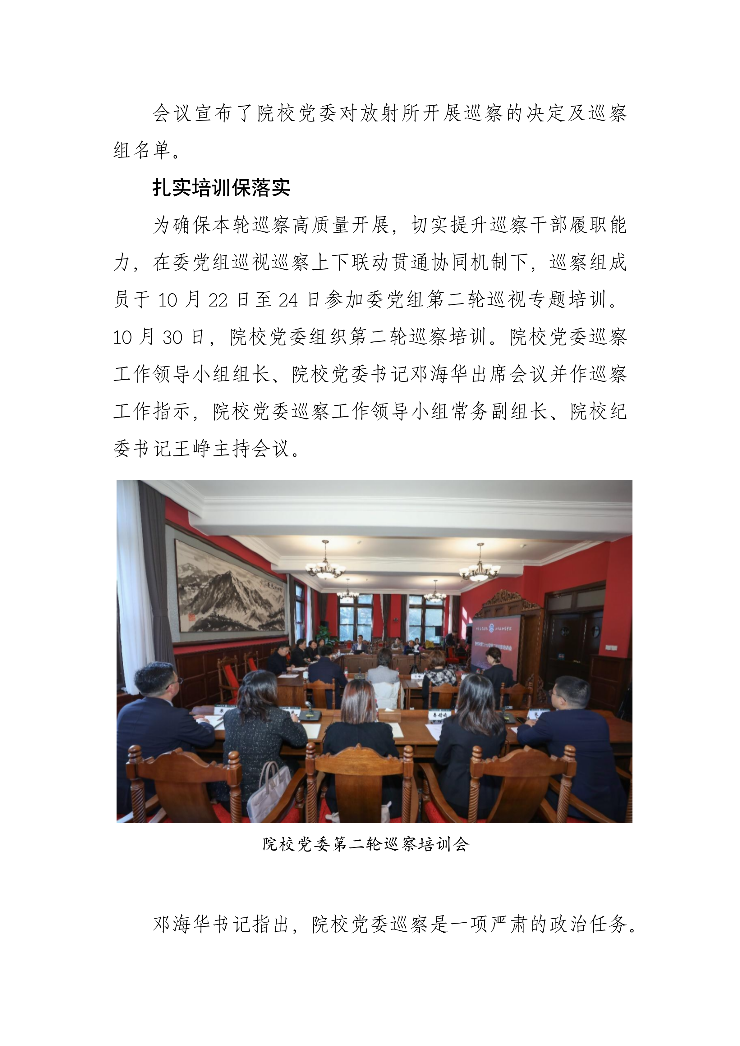 為確保本輪巡察高質量開展,切實提升巡察干部履職能力,在委黨組巡視巡察上下聯動貫通協同機制下,巡察組成員于10月22日至24日參加委黨組第二輪巡視專題培訓。10月30日,院校黨委組織第二輪巡察培訓。院校黨委巡察工作領導小組組長、院校黨委書記鄧海華出席會議并作巡察工作指示,院校黨委巡察工作領導小組常務副組長、院校紀委書記王崢主持會議。