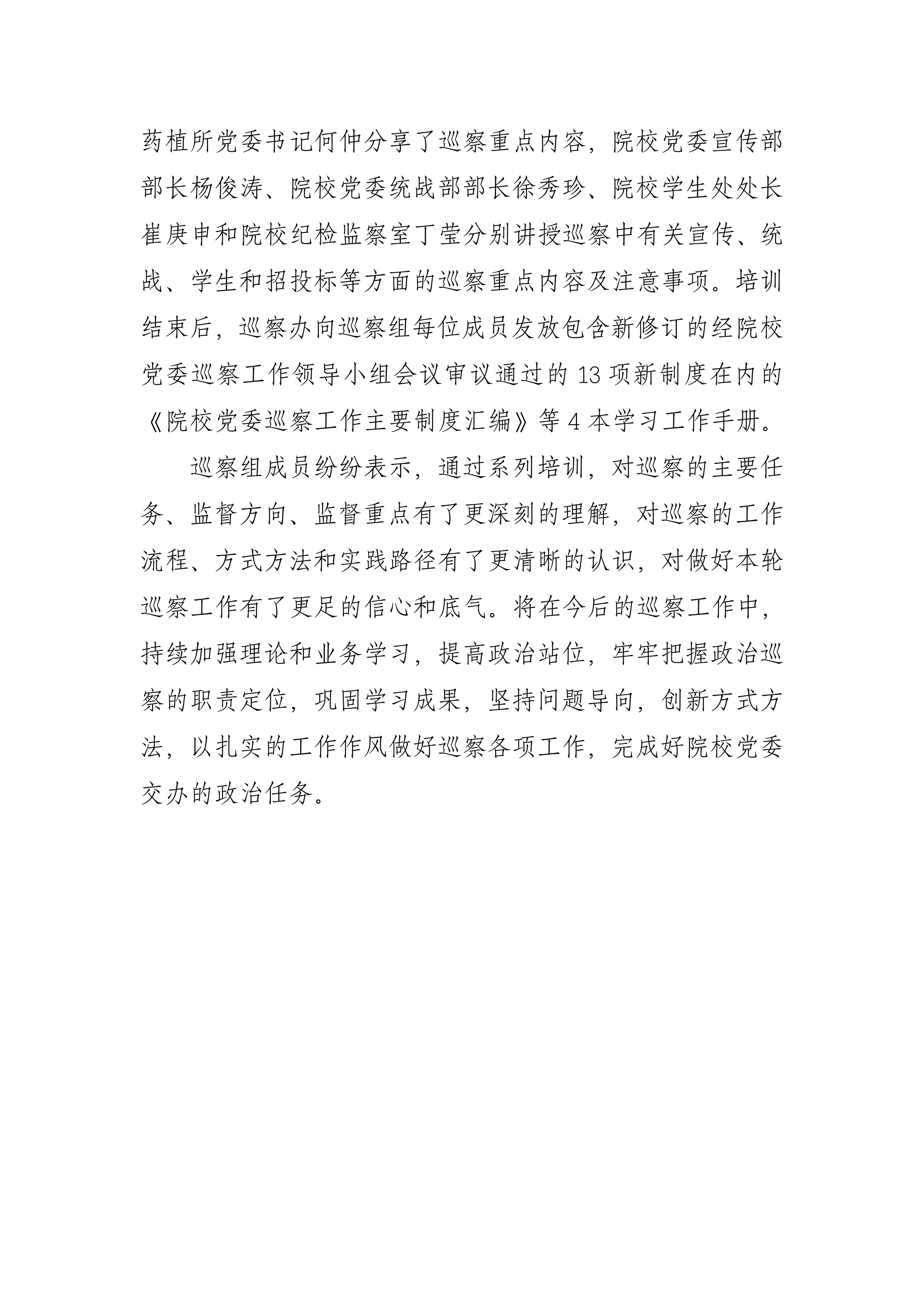 培訓中,院校黨委二十大后首輪巡察第一巡察組組長、藥植所黨委書記何仲分享了巡察重點內容,院校黨委宣傳部部長楊俊濤、院校黨委統戰部部長徐秀珍、院校學生處處長崔庚申和院校紀檢監察室丁瑩分別講授巡察中有關宣傳、統戰、學生和招投標等方面的巡察重點內容及注意事項。培訓結束后,巡察辦向巡察組每位成員發放包含新修訂的經院校黨委巡察工作領導小組會議審議通過的13項新制度在內的《院校黨委巡察工作主要制度匯編》等4本學習工作手冊。