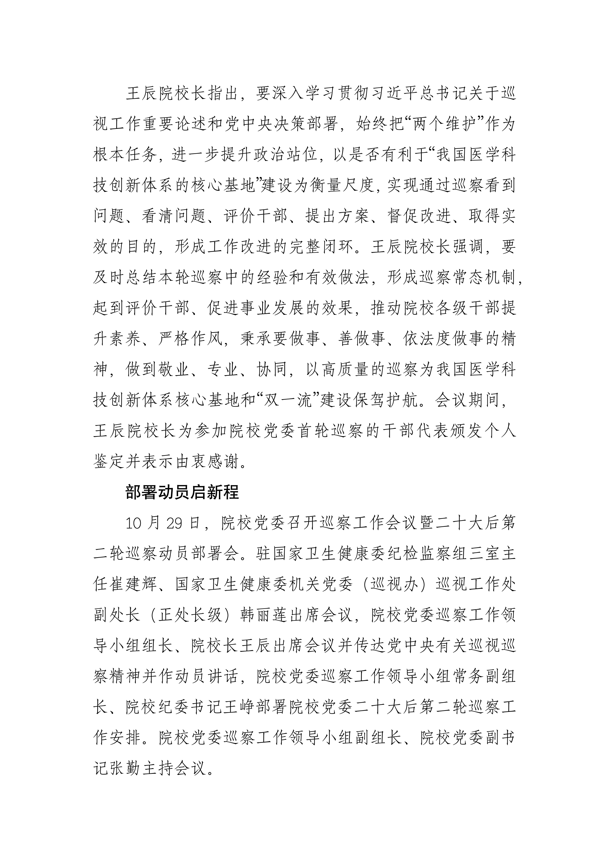 王辰院校長強調,要深入學習領會習近平總書記關于黨的自我革命的重要思想和關于巡視工作的重要論述,學習貫徹二十屆中央紀委三次全會、全國巡視工作會議、國家衛生健康委黨組和院校黨委工作部署,聚焦新時代新征程黨的使命任務,牢牢把握巡視工作方針,找準政治巡察職責定位,著力查找巡察政治偏差,緊盯權力和責任,緊盯“一把手”和領導班子,緊盯影響事業發展的突出問題和群眾反映強烈的問題,重點對“四個聚焦”問題進行監督檢查,牢固樹立問題意識,精準把握監督重點,從嚴從實、嚴肅認真規范做好各項工作,以高質量的巡察成果為核心基地建設提供堅強的政治和組織保障。