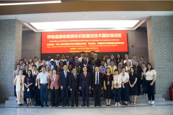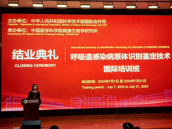 2024年7月19日,由科學技術部國際合作司主辦,中國醫學科學院病原生物學研究所承辦的“呼吸道感染病原體識別鑒定技術國際培訓班”結業式在京舉行。科學技術部國際合作司秦衛東二級巡視員,劉華一級調研員,中國醫學科學院北京協和醫學院副院校長、克里斯托弗﹒梅里埃實驗室主任王健偉研究員,中國醫學科學院病原生物學研究所所長舒躍龍研究員、副所長任麗麗研究員,授課專家、志愿者和來自馬里、毛里塔尼亞、喀麥隆、剛果(布)、巴西、孟加拉、哈薩克斯坦、剛果(金)8個國家研究機構的22位學員參加結業式。