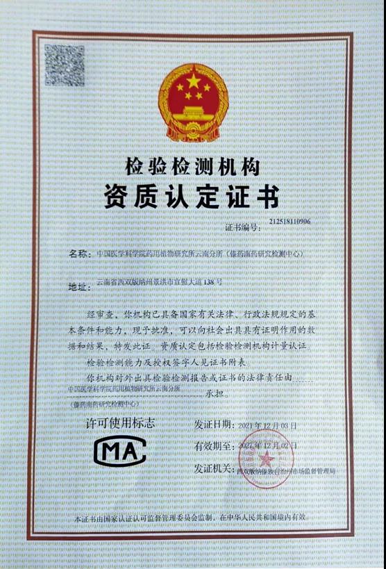 2021年12月3日,中國醫學科學院藥用植物研究所云南分所傣藥南藥研究檢測中心獲頒《檢驗檢測機構資質認定證書》(CMA),標志著藥植所云南分所已具備向社會出具國家認可的檢驗檢測報告的能力,可向社會開展第三方檢驗檢測服務。