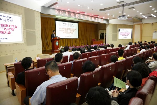 2016年院校醫療管理工作會暨貫徹落實“九不準”廉潔行醫大會于4月28日在院校新教學科研樓八樓報告廳舉辦。院校姚龍山副書記、鄭忠偉副院校長、王云峰副書記、張勤副院校長、張抒揚副院校長等領導出席會議。院校所屬各醫院及新近納入院校管理體系的泰達國際心血管病醫院黨政領導、醫務處、護理部、院感辦、醫保辦、醫患辦、教育處、紀檢監察部門、保衛部門、臨床科室負責人代表,天津醫科大學總醫院、南京鼓樓醫院、中日友好醫院、北京醫院院校4所合作教學醫院代表,院校機關各部門負責人等近百人參加會議。張抒揚副院校長代表院校在大會上致辭。會議由院校醫院管理處王海濤處長主持。