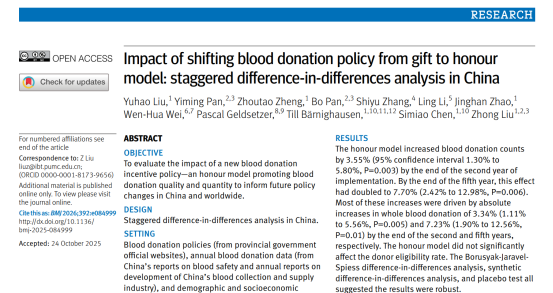 2026年1月21日,中國(guó)醫(yī)學(xué)科學(xué)院輸血研究所劉忠教授,北京協(xié)和醫(yī)學(xué)院群醫(yī)學(xué)及公共衛(wèi)生學(xué)院陳思邈教授,聯(lián)合中國(guó)政府友誼獎(jiǎng)獲得者、德國(guó)海德堡大學(xué)醫(yī)學(xué)院全球衛(wèi)生研究院院長(zhǎng)Till B?rnighausen教授團(tuán)隊(duì),在The BMJ(《英國(guó)醫(yī)學(xué)雜志》)在線發(fā)表原創(chuàng)研究論文“Impact of shifting blood donation policy from gift to honour model: staggered difference-in-differences analysis in China”。《BMJ》同步為該成果配發(fā)專題社論與新聞報(bào)道,并通過美國(guó)科學(xué)促進(jìn)會(huì)(AAAS,期刊 Science 主辦單位)官方網(wǎng)站EurekAlert!等全球3000余家權(quán)威媒體平臺(tái)同步推送,向國(guó)際社會(huì)系統(tǒng)展現(xiàn)中國(guó)在公共衛(wèi)生政策創(chuàng)新領(lǐng)域的突破性研究成果。