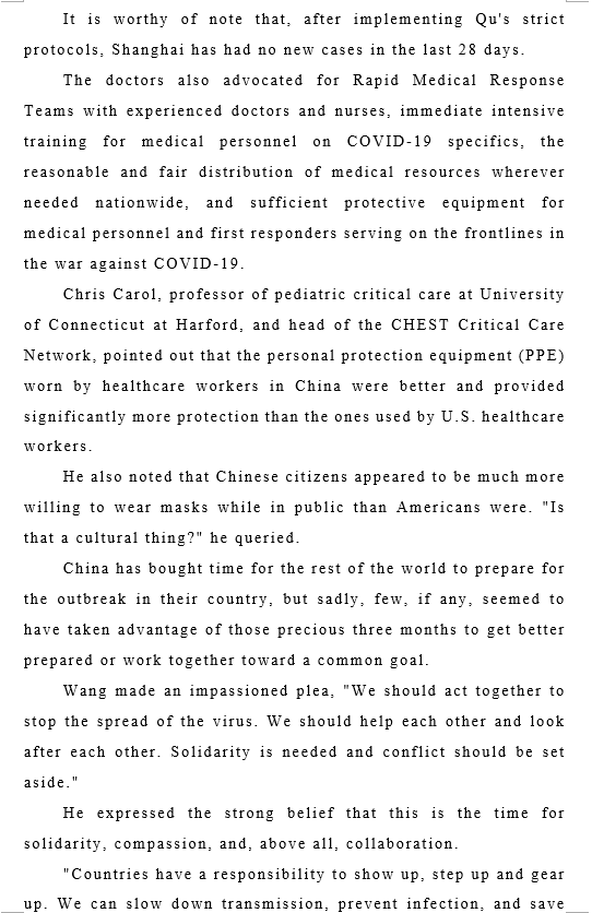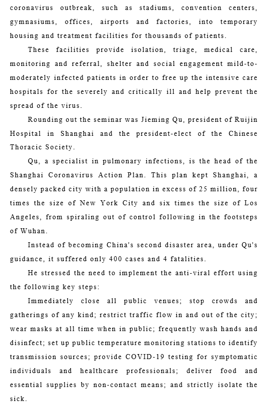 國內派出了醫療界最權威的四位講者,包括中國醫學科學院院長王辰教授,上海瑞金醫院的瞿介明教授,中日友好醫院的曹彬和詹慶元教授。這幾位都是有關專業學會的主要負責人,而且都是帶著在武漢前線親臨一線的幾個月的實戰經驗,美國這邊也是學會主席與董事長親自主持坐鎮。不僅如此,中華人民共和國駐洛杉磯的總領事張平大使也親自致辭。