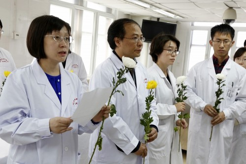 最后,全體教師和學生向大體老師三鞠躬并默哀致敬一分鐘,結束了開課儀式。