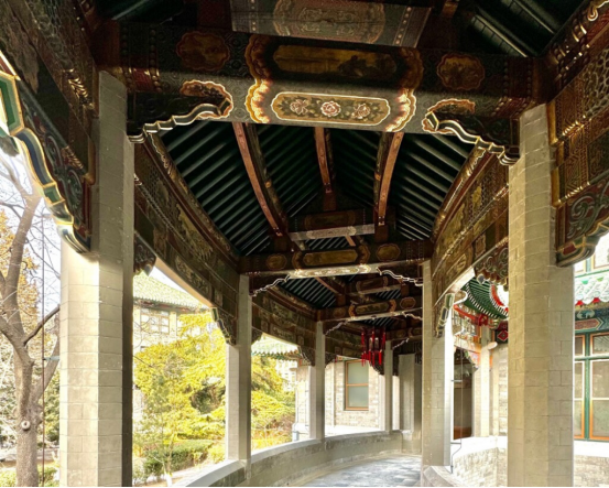 自20世紀70年代起,弧形廊被改造為辦公用房,其內檐彩畫被隱藏于吊頂之中,不為人知。直到2021年弧形廊內吊頂被拆除,建筑始建初期繪制的彩畫才得以重見天日?!敖浳奈飳<诣b定,這是一處民國初年彩畫,是彩畫中的精品?!备邩氛f。