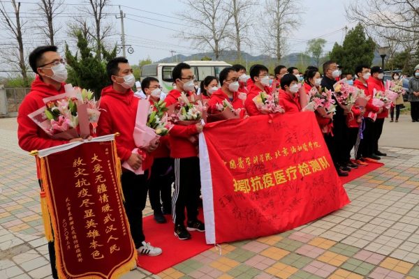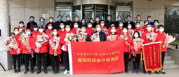 當天,院校在協和湯山健康隔離中心舉行了簡約而熱烈的歡迎儀式。院校領導和各所院領導為檢測隊員們獻上鮮花,代表全體師生祝賀他們實現“零感染,打勝仗,凱旋歸”目標,表達對援鄂英雄的誠摯感謝和崇高敬意。