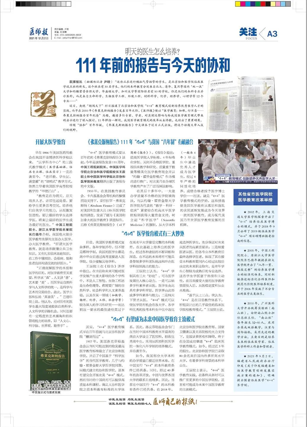 近日,央視“朝聞天下”欄目報道了北京協和醫學院“4+4”教育模式創新培養優秀醫學人才的實踐。而早在2010年《弗萊克斯納報告》發表百年之際,《醫師報》便以“醫學教育:知難,行不易——弗萊克斯納報告百年紀念”為題,邀請多位專家、學者,對其深遠影響與給我國醫學教育模式帶來的啟示進行了深入探討。11年彈指一揮間,我國醫學教育模式的改革從未停歇,也結出了累累碩果。