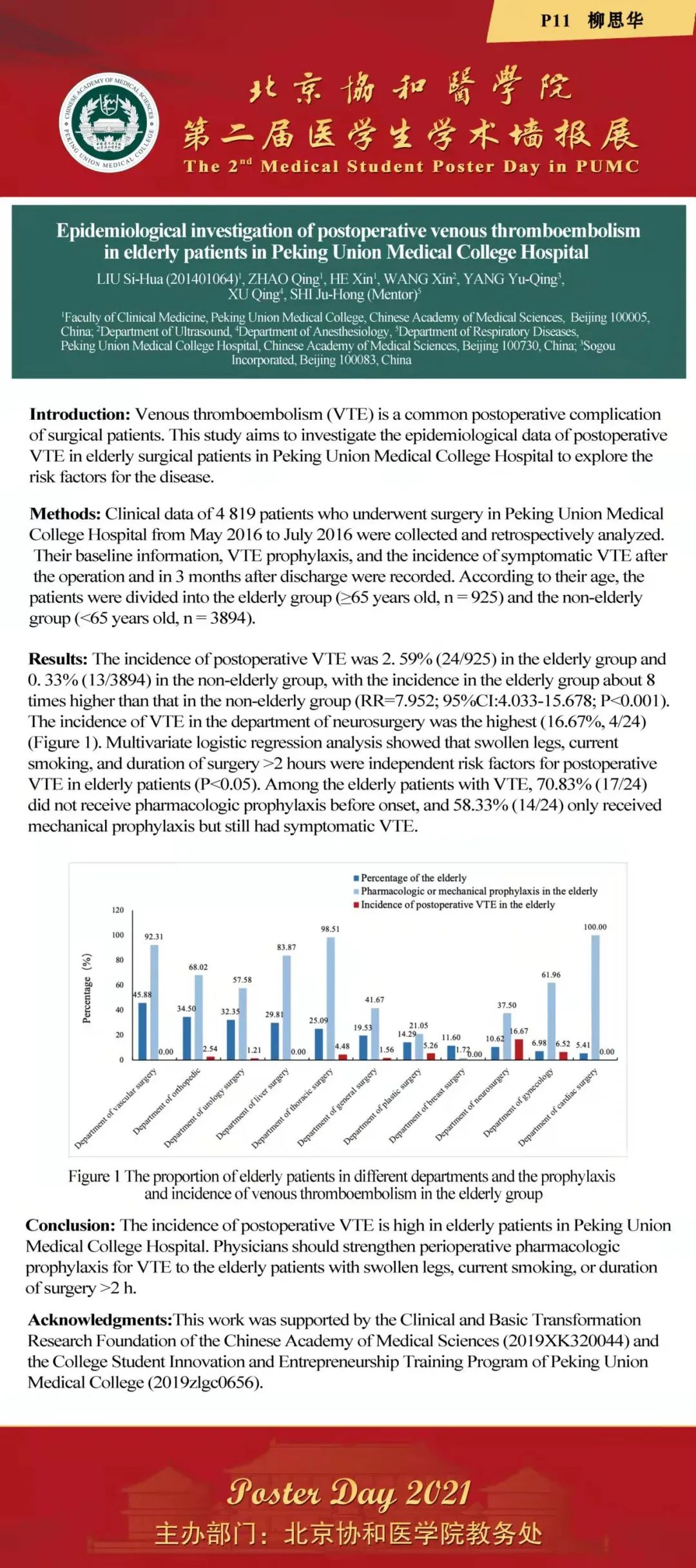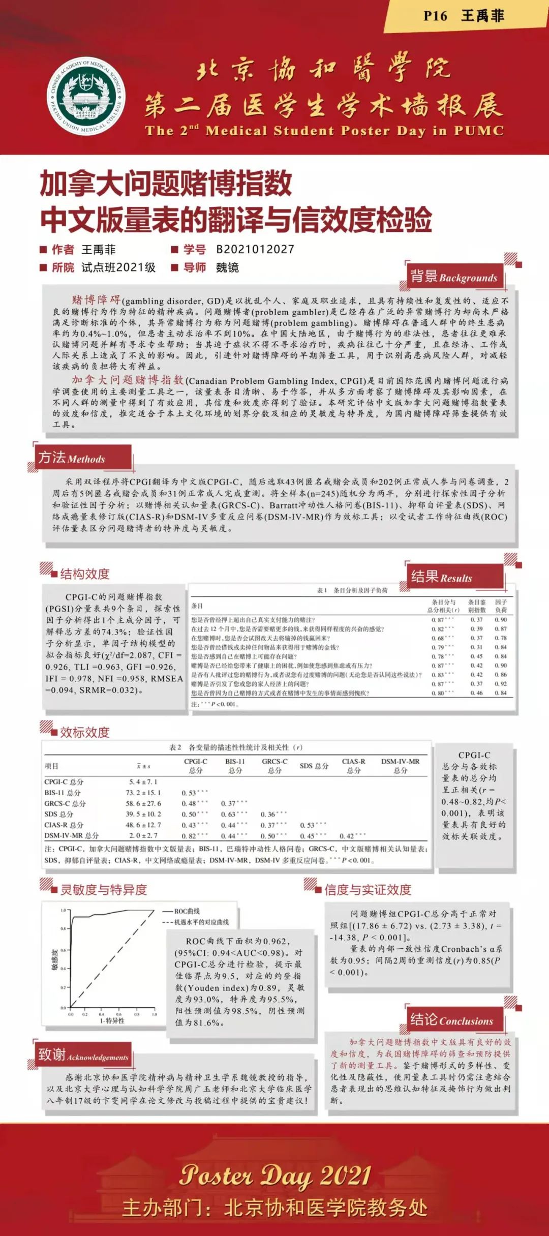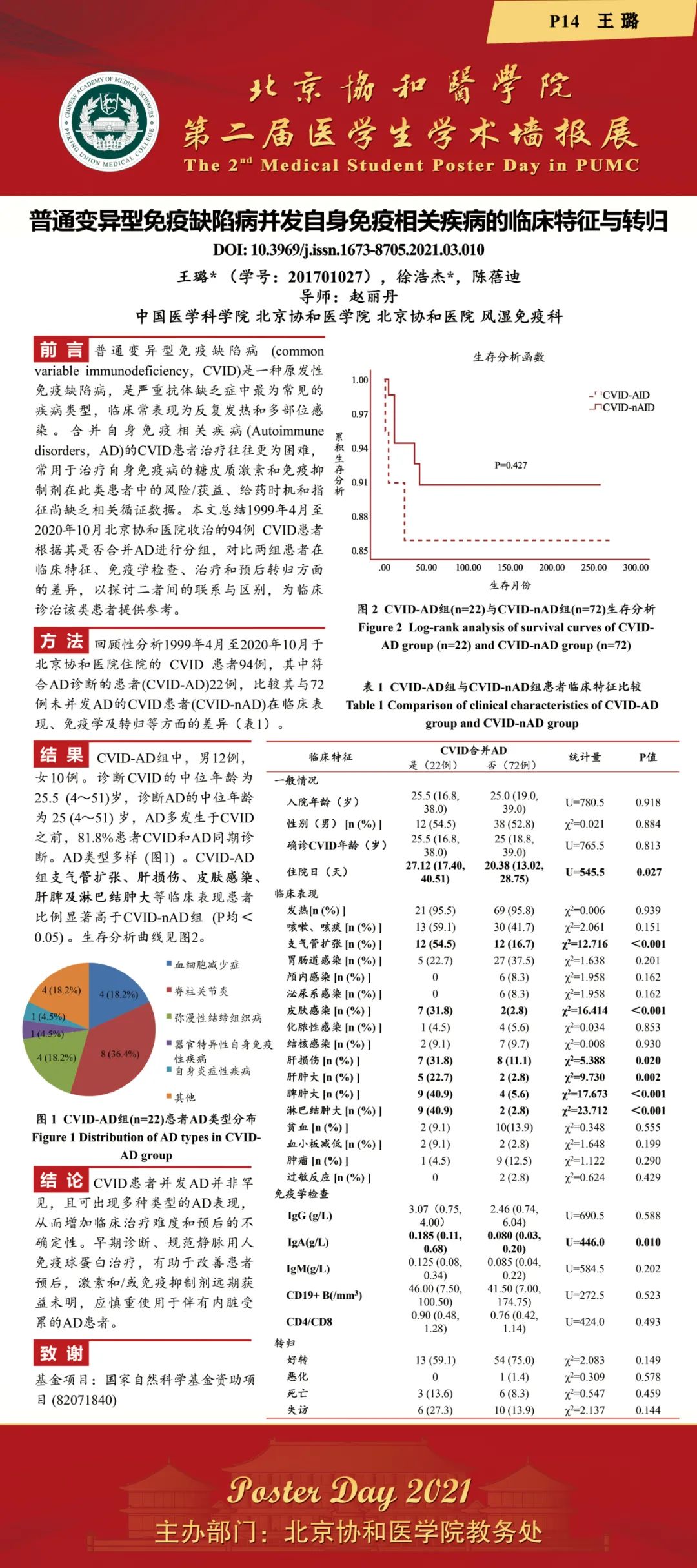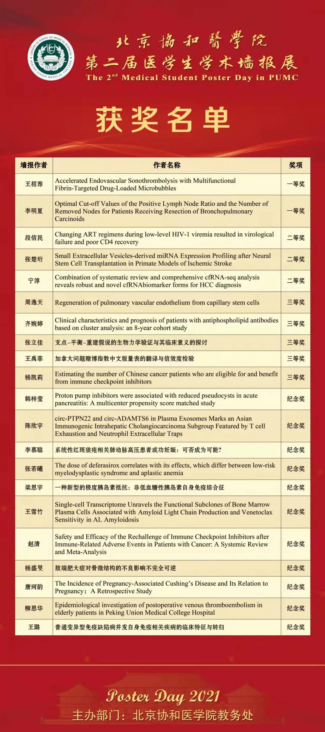 2021年12月3日,由教務處舉辦的“北京協和醫學院2021年第二屆醫學生學術墻報展”在吳憲大樓一層大廳進行了墻報交流和評選活動。經過專家和學生共同評選,評出一等獎2項,二等獎3項,三等獎5項和紀念獎11項。