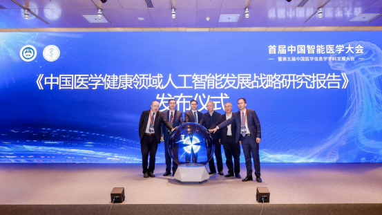 吉訓明院校長、趙沁平院士、鄧海華書記、王振常院士、潘慧副院校長、中國醫學科學院醫學信息研究所所長劉輝共同發布了《中國醫學健康領域人工智能發展戰略研究報告》。